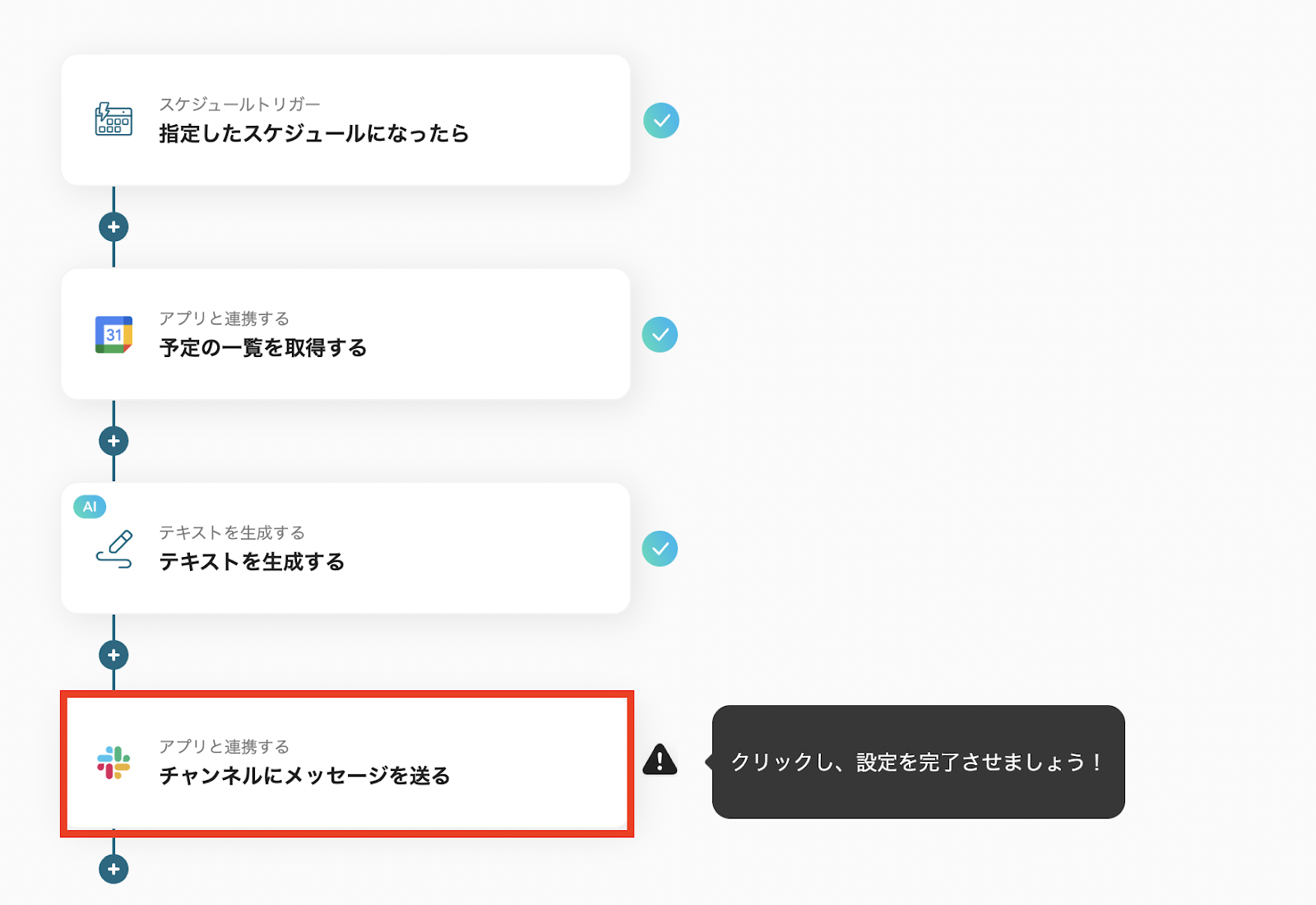 スケジュールトリガーの設定から、AI機能でのテキスト生成までの設定が終わったら「チャンネルにメッセージを送る」をクリックします。