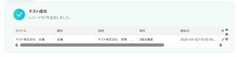 (7)設定が完了したら、実際にGoogleカレンダーに仮の予定を作成してみましょう。 予定を作成後に「テスト」を実行し、作成した予定の内容がアウトプット しっかり抽出されていれば「保存する」をクリックして設定完了です。