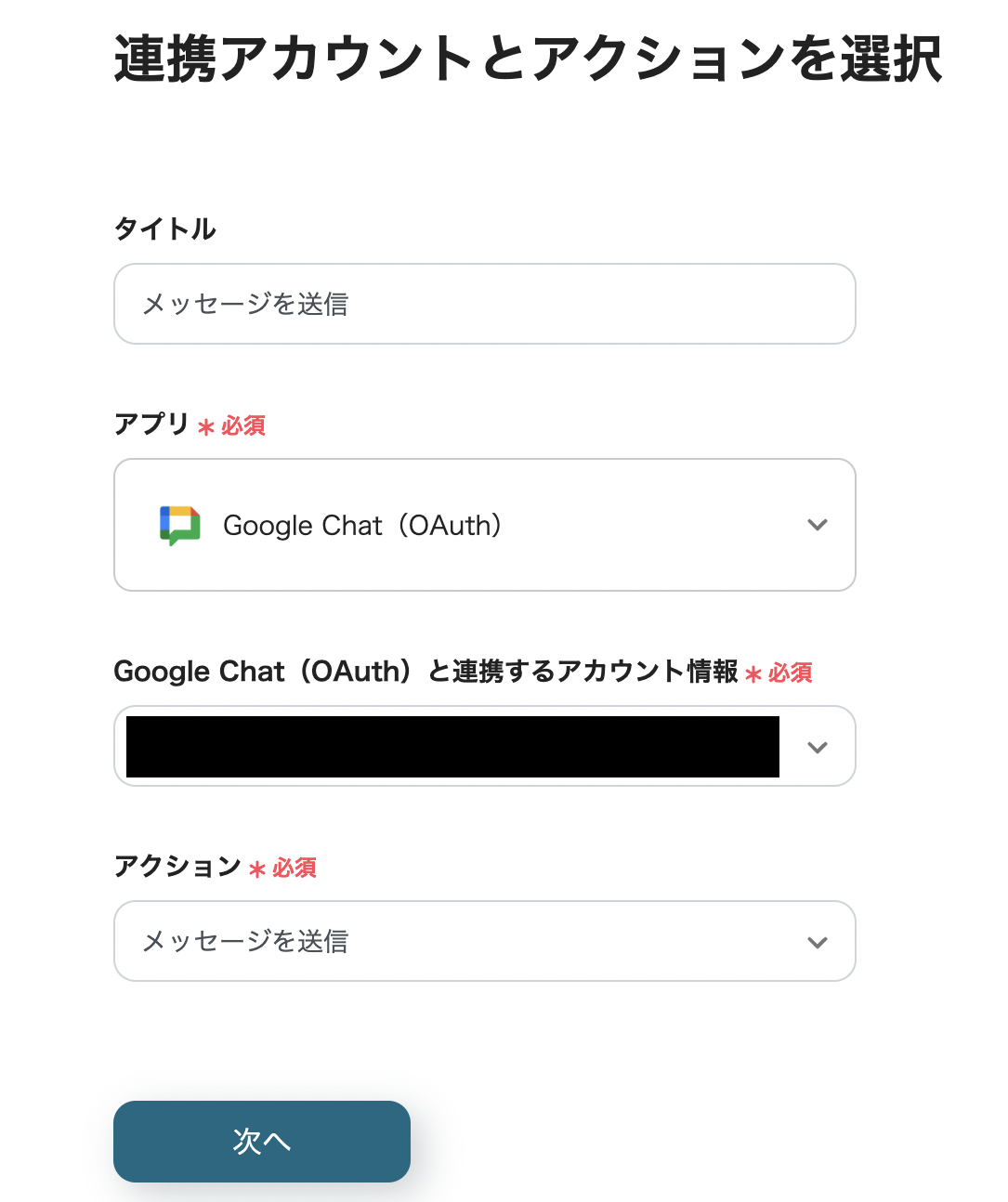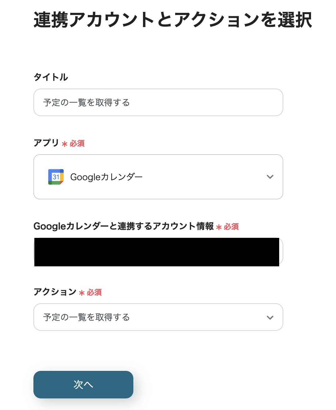 連携するアカウントとアクションを選択して「次へ」を押します。
