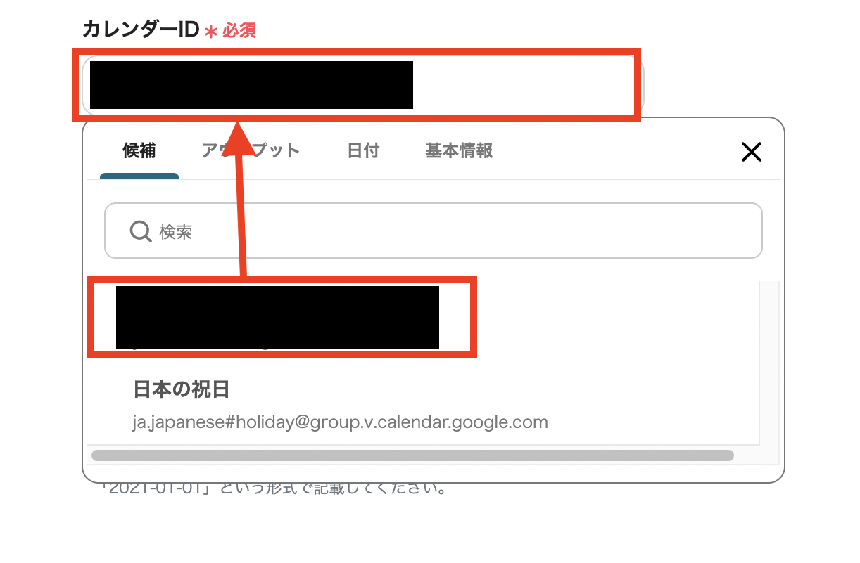 「カレンダーID」の入力欄をクリックすると候補が表示されるため、選びましょう。