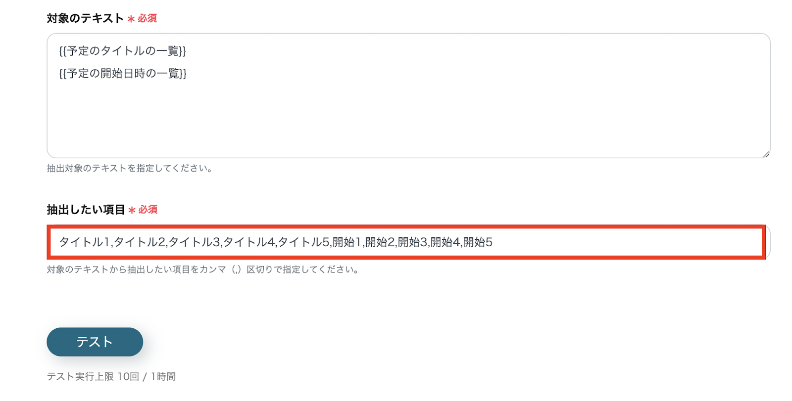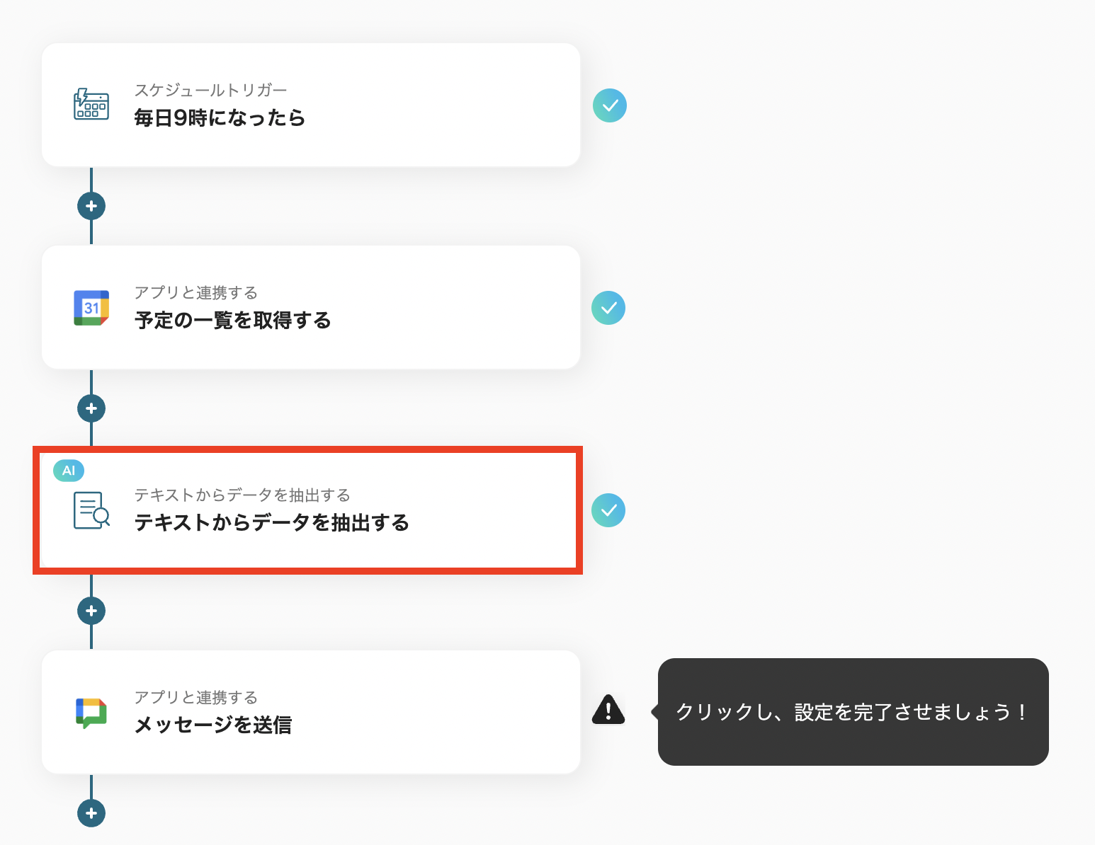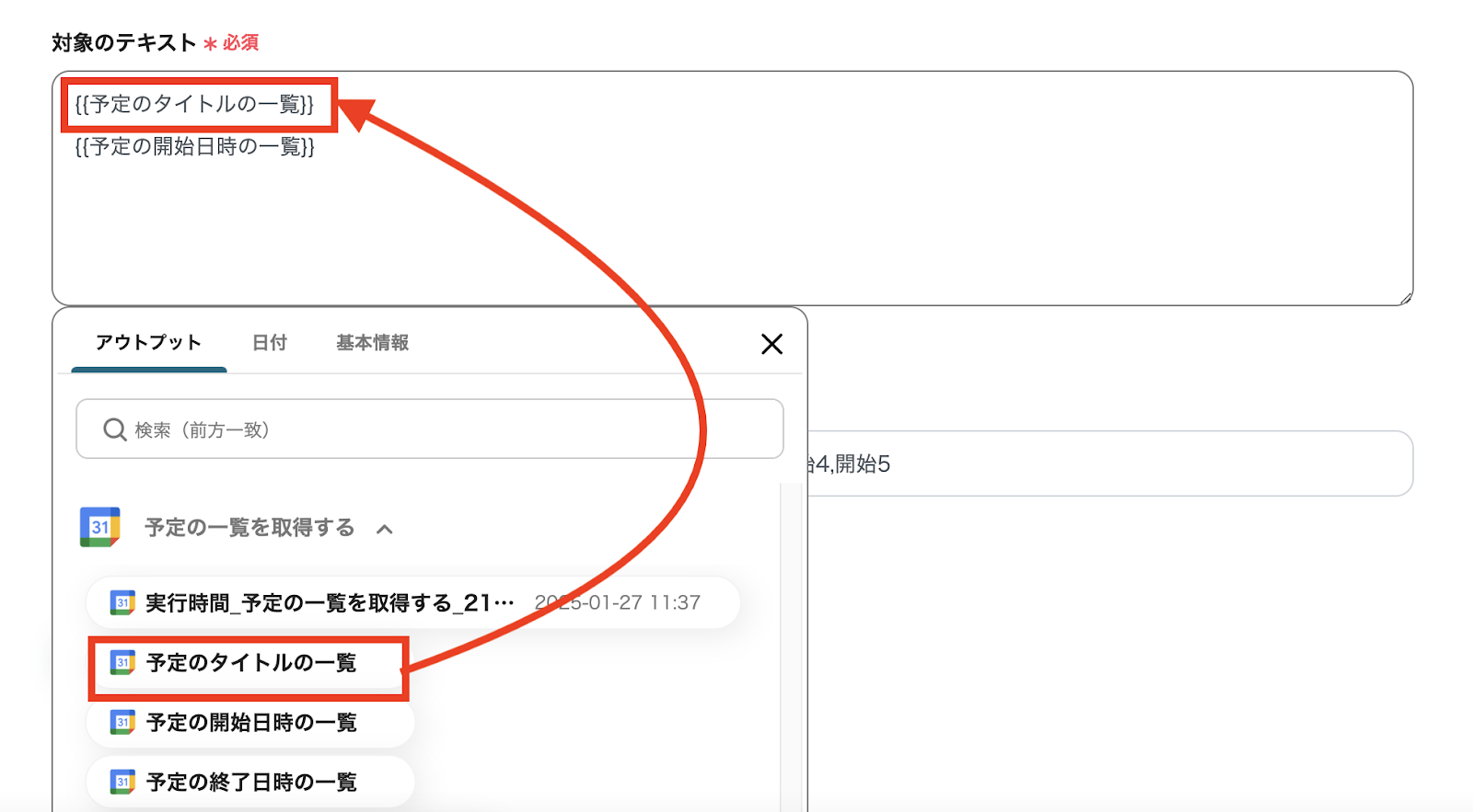 テキストから抽出したデータ(ステップ4)を活用することで、タスクごとのタイトルと開始時間をそれぞれ設定することが可能です。