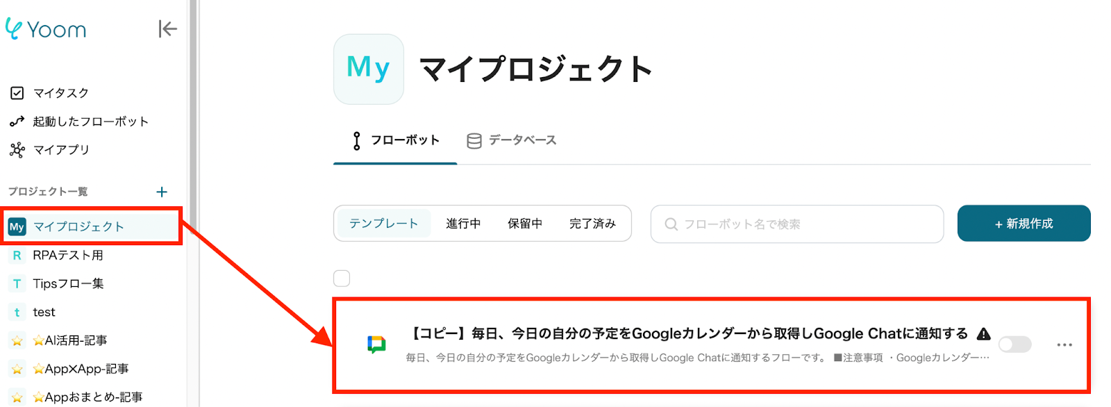 左側にあるメニューの「マイプロジェクト」から、コピーしたテンプレートを開きます。