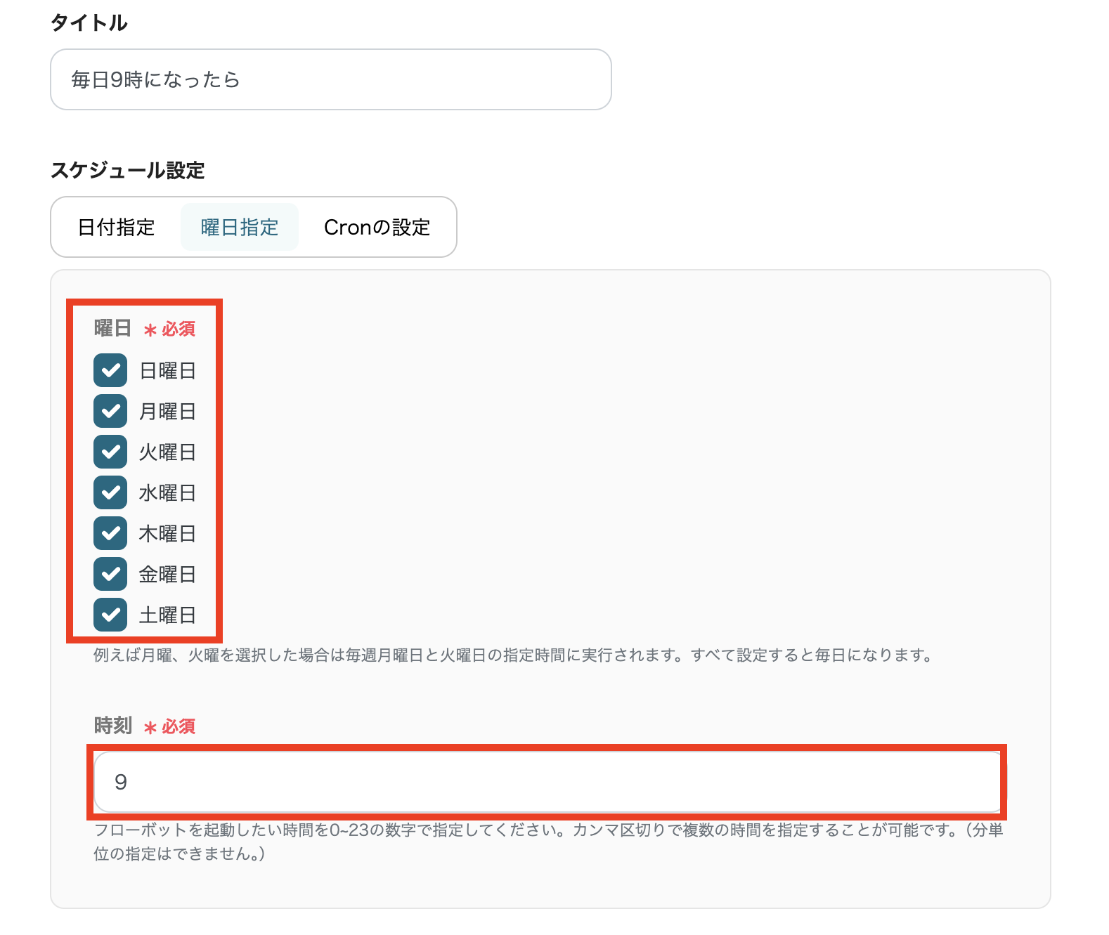 ※「Cronの設定」では、1日のうちに何度も起動したい場合や、曜日によって別の時間帯に起動したいなどの細かな設定が可能です。設定の詳しい設定方法はこちらをご確認ください。