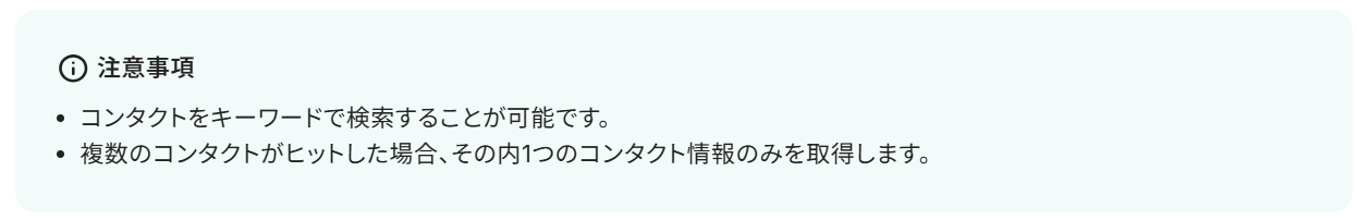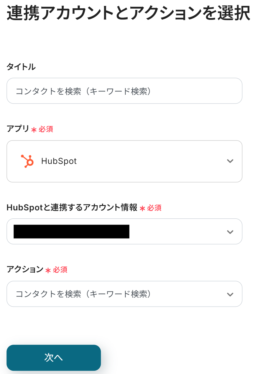 続いて、HubSpotでコンタクトをキーワードで検索する設定を行うため、「コンタクトを検索(キーワード検索)」をクリックします。