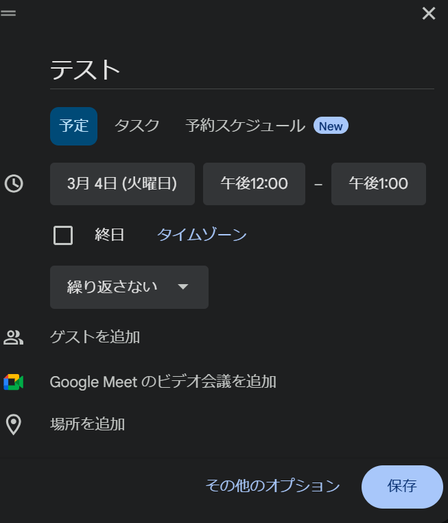 Googleカレンダーの画面に移動し、テスト用に予定を登録してください。