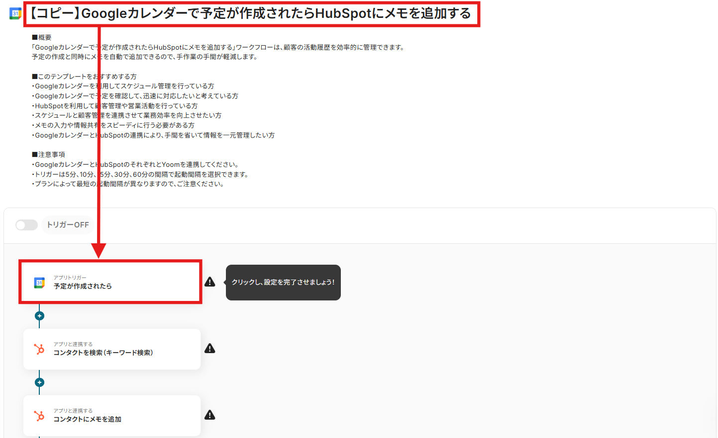 こちらがGoogleカレンダーで予定が作成されたらHubSpotにメモを追加するフローでした。