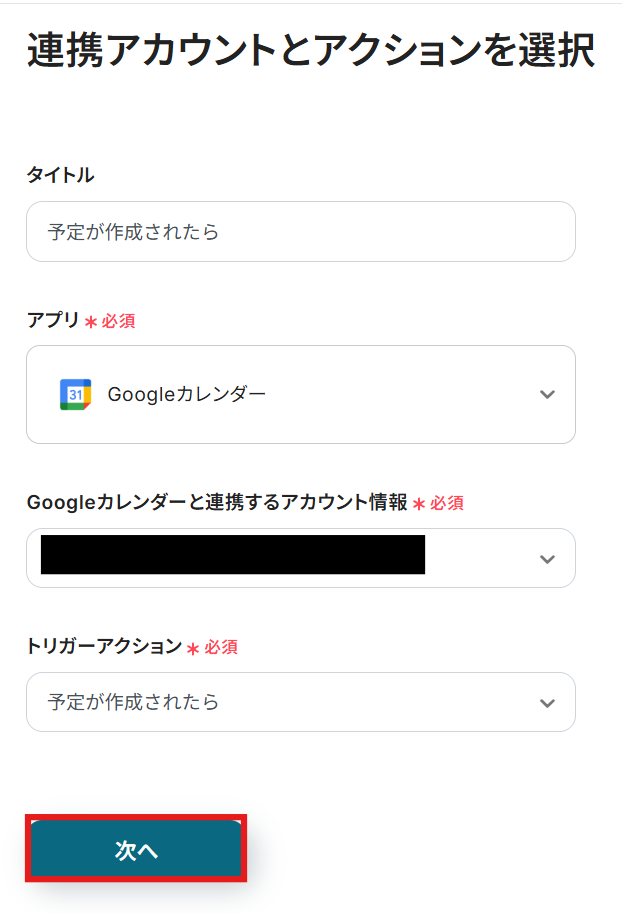 タイトルは任意でわかりやすいものを設定しましょう。 アカウント情報は、マイアプリ連携の際に設定したものになっているか確認してください。 アクションはデフォルトで入力されている状態のままで進めます。