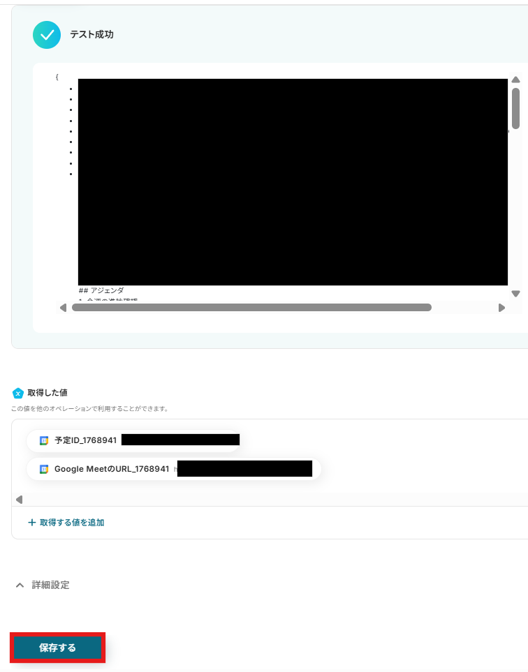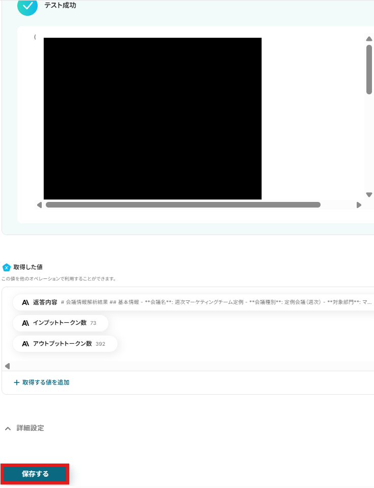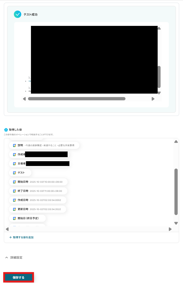 テストが成功したら、「取得した値」が表示されます。問題なければ設定を保存し次へ進みましょう。