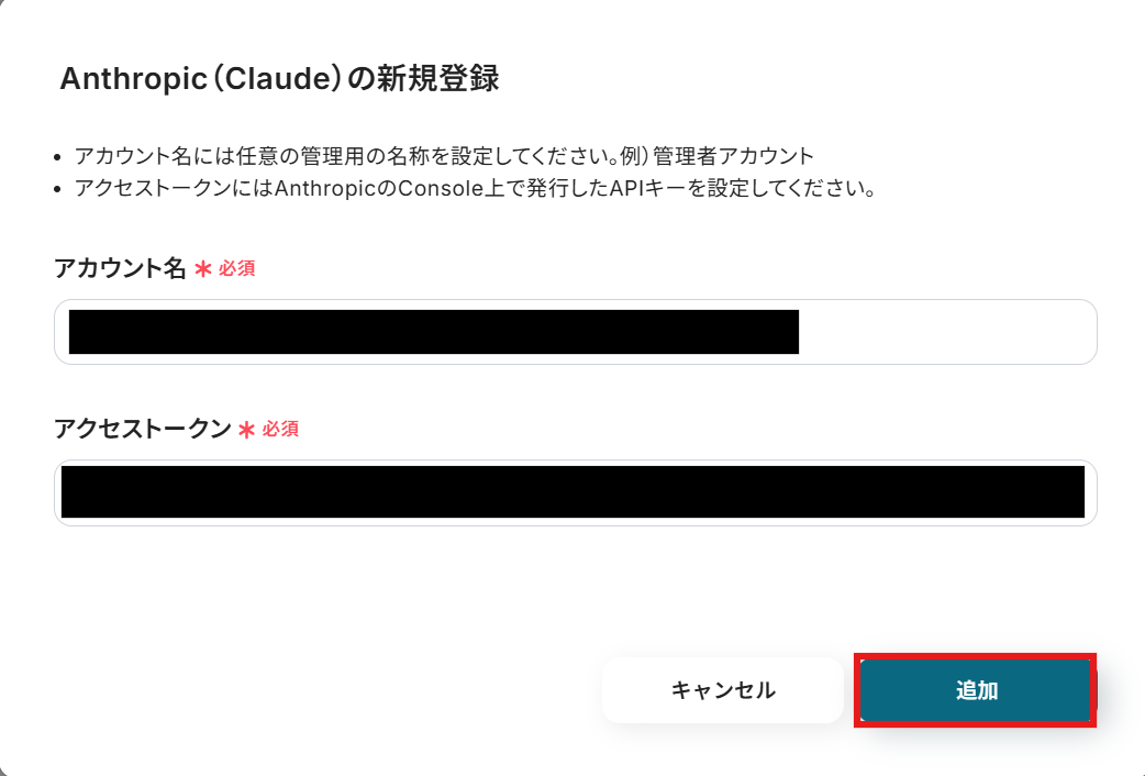 画面の案内に沿って、Anthropic(Claude)のアカウント名とアクセストークンを入力します。 アクセストークンは、AnthropicのConsole内で発行し、入力します。 入力できたら「追加」をクリックしましょう。