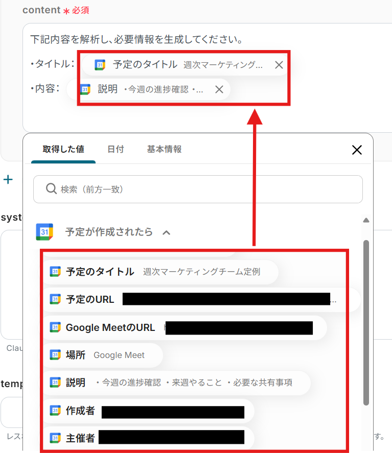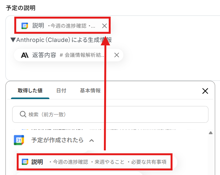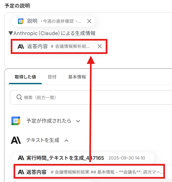 同じく予定の説明の欄に、生成されたテキストも入力します。 生成されたテキストは、取得した値の中の「テキストを生成」から選びましょう。