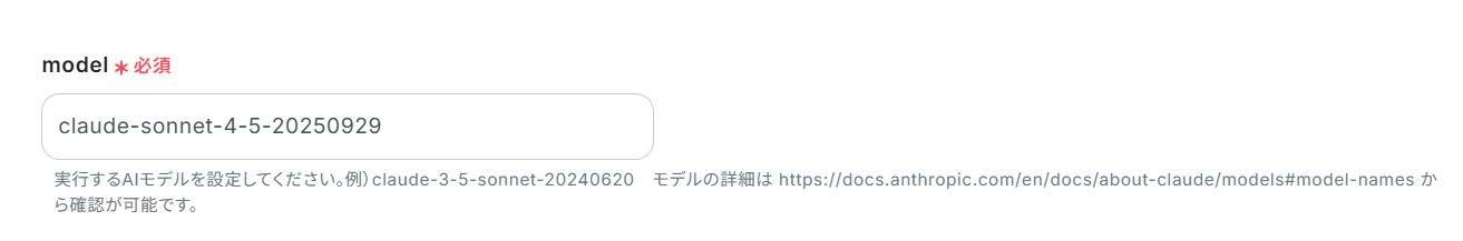 次に、使用するClaudeのモデルを選択しましょう。 今回はデフォルトで設定されているまま進めていきたいと思います。