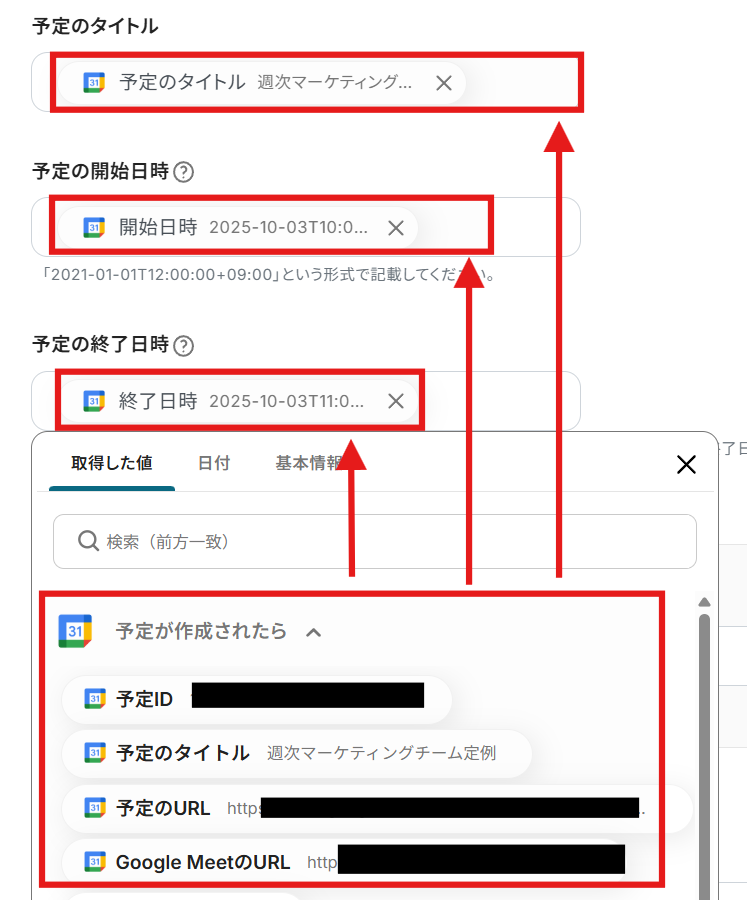 予定のタイトルや予定の開始・終了日時なども同様に取得した値の「予定が作成されたら」から入力していきましょう。