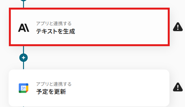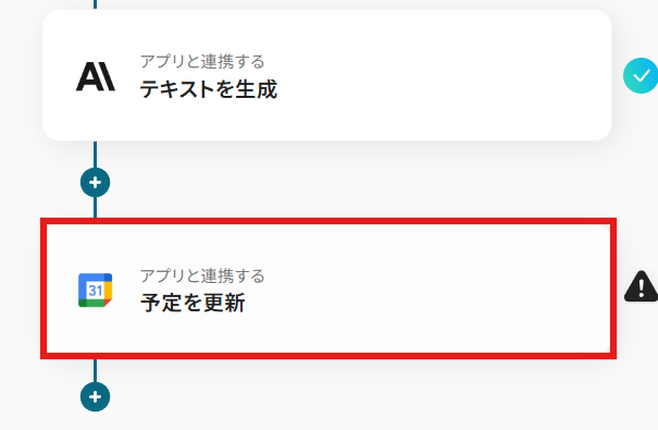 次に、先ほど生成したテキストをもとにGoogleカレンダーの予定を更新するアクションの設定を進めていきましょう。 赤枠の「予定を更新」をクリックします。