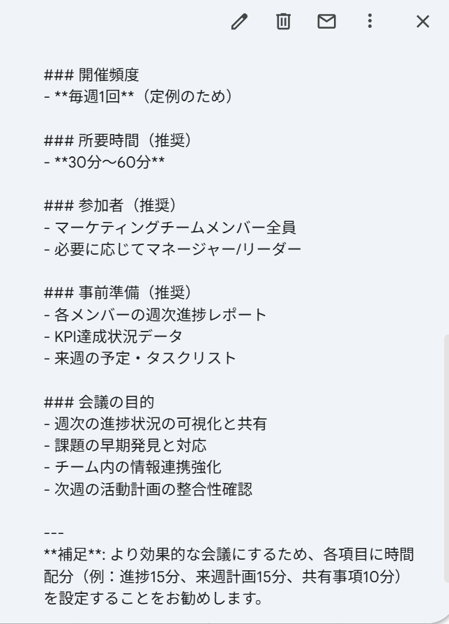 これにより、会議の準備時間を削減できるだけでなく、本来注力すべき議題の検討や戦略立案といった、より創造的で付加価値の高い業務に集中できる環境が整います!