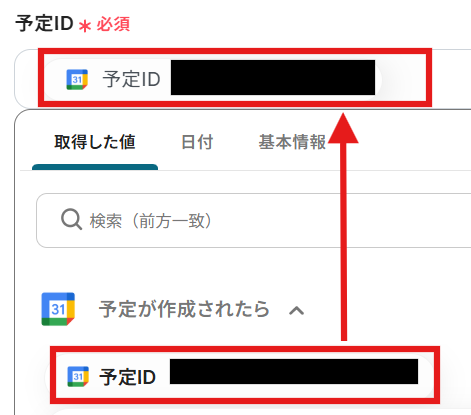 予定IDは、先ほど取得した値の「予定が作成されたら」の中から選択 しましょう。