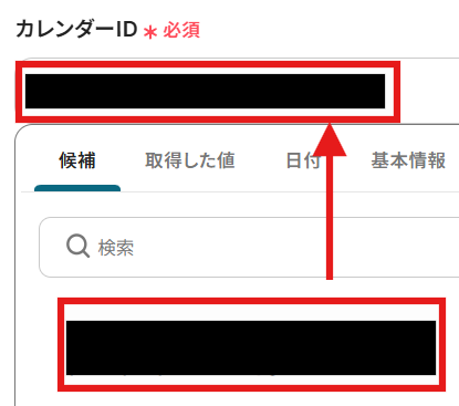 次に、カレンダーIDを入力します。 入力欄をクリックすると選択肢が表示されますので、候補の中から連携したいカレンダーIDを選びましょう。