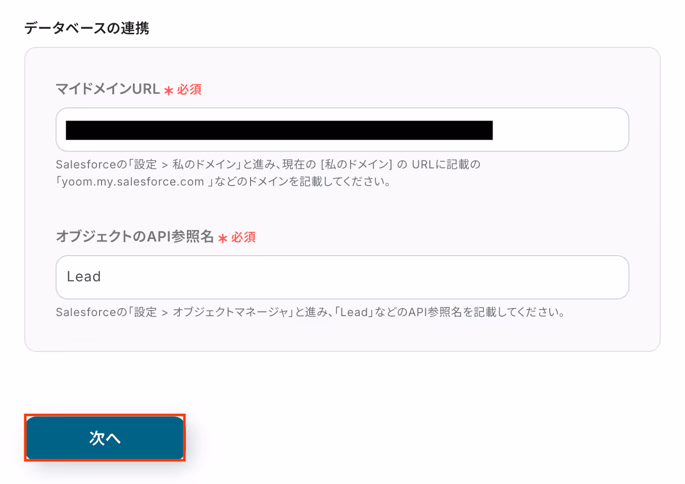 Salesforceと連携するアカウント情報に問題がなければ、「次へ」をクリックします。
