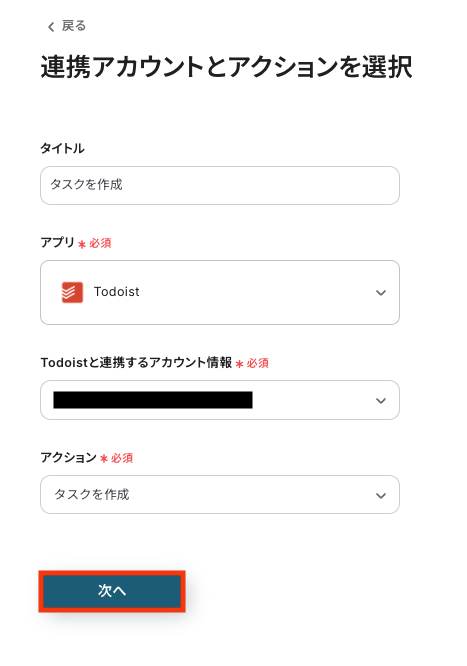 Todoistと連携するアカウント情報に問題がなければ、「次へ」をクリックします。