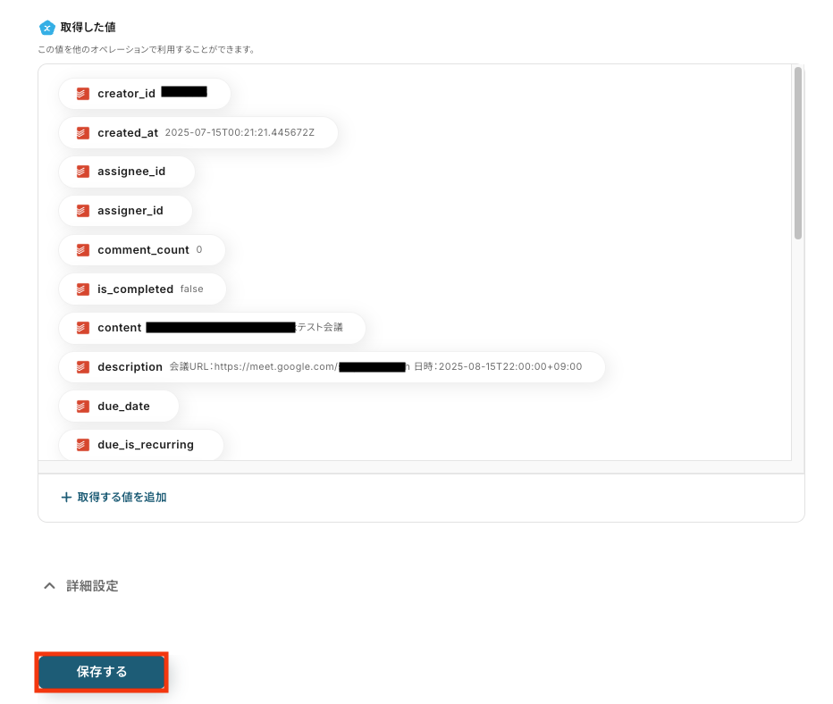 問題がなければYoomの操作画面に戻り取得した値を確認し、「保存する」をクリックします。