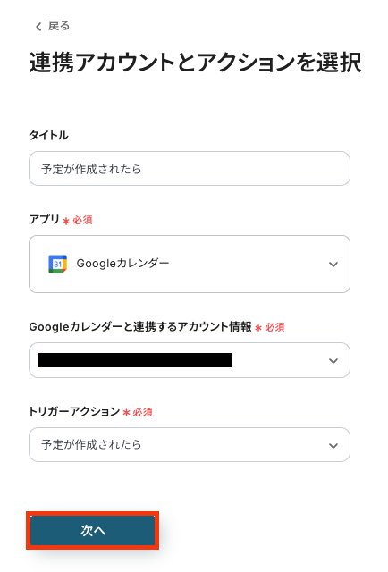 予定の作成をきっかけにトリガーを起動させるGoogleカレンダーを指定します。