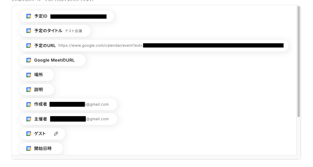 入力欄をクリックすると、前のステップでGoogleカレンダーから取得したアウトプットを選択できます。
