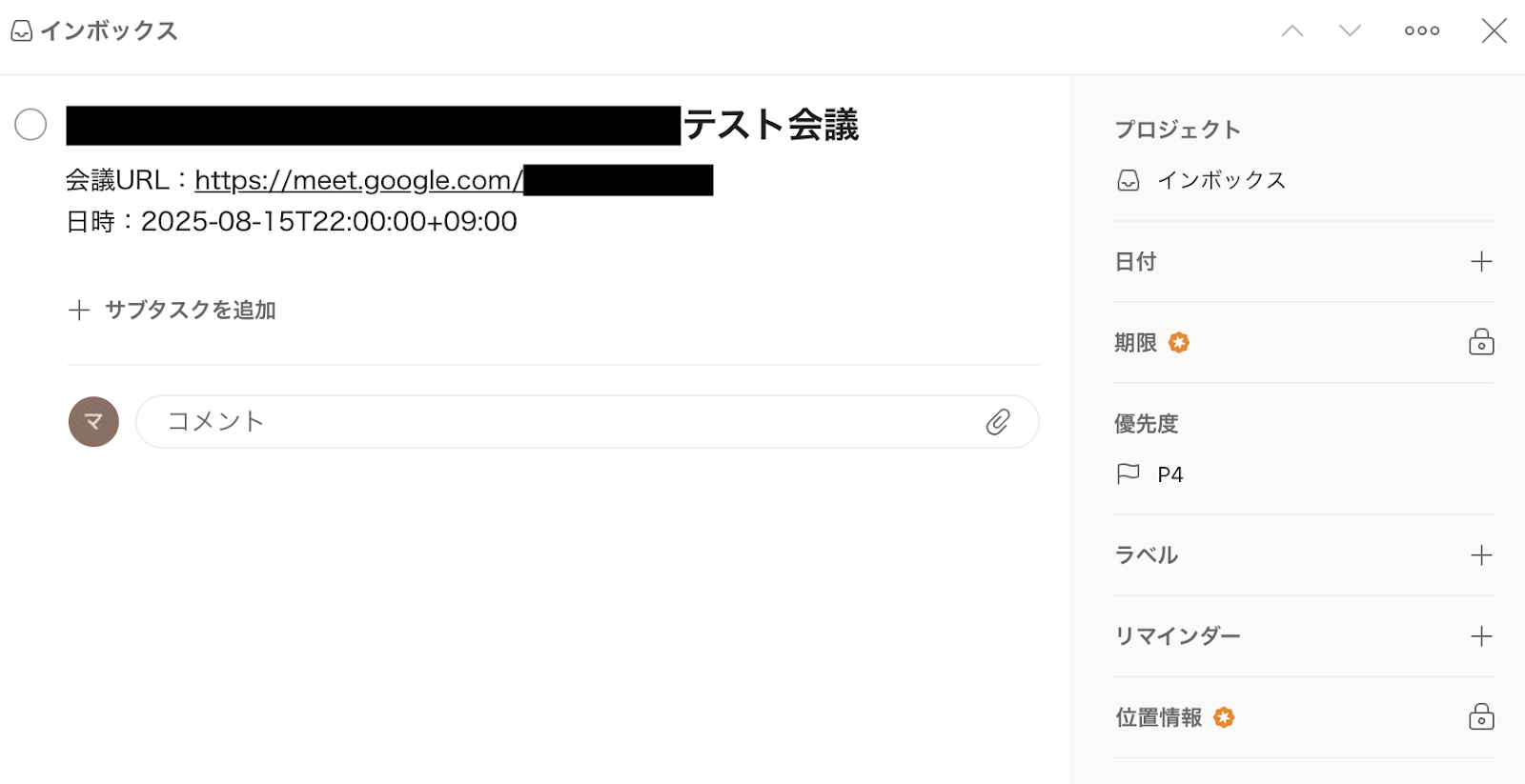 実際にGoogleカレンダーで予定を作成し、Todoistにタスクが作成されるかを確認してみましょう。