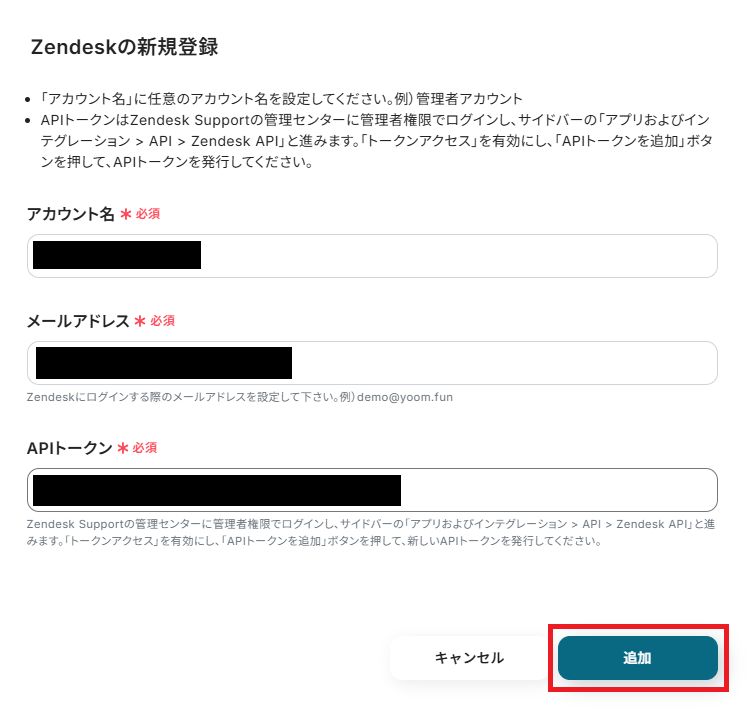 Zendeskの新規登録画面が表示されるので、注釈に従って「アカウント名」「メールアドレス」「APIトークン」を入力します。