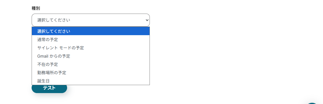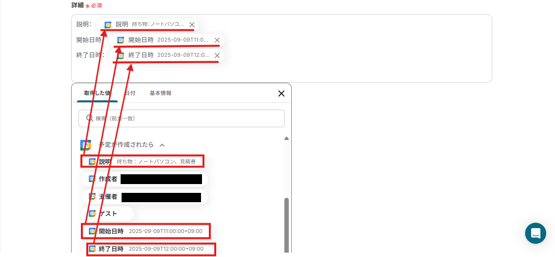 「テスト」をクリックし、テストが成功すると、Googleカレンダーに先ほど登録した予定の情報が取得した値に表示されます、
