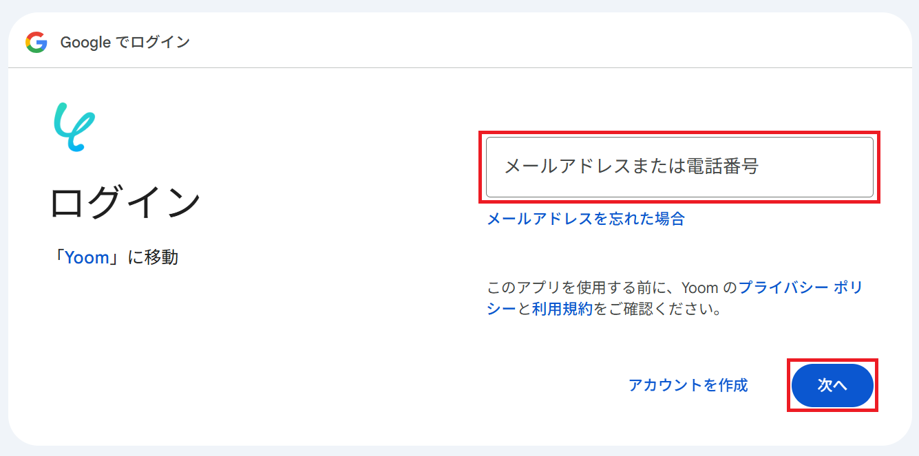 メールアドレスまたは電話番号を入力したら、「次へ」をクリックします。