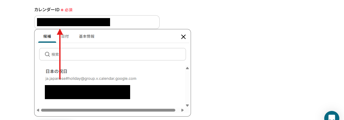 カレンダーIDは、枠内をクリックし表示される候補から選択してください。