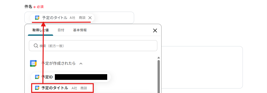 このように設定することで、Googleカレンダーに予定が登録されたら「予定のタイトル」を自動で取得し、Zendeskのチケットの「件名」に自動で登録可能です。