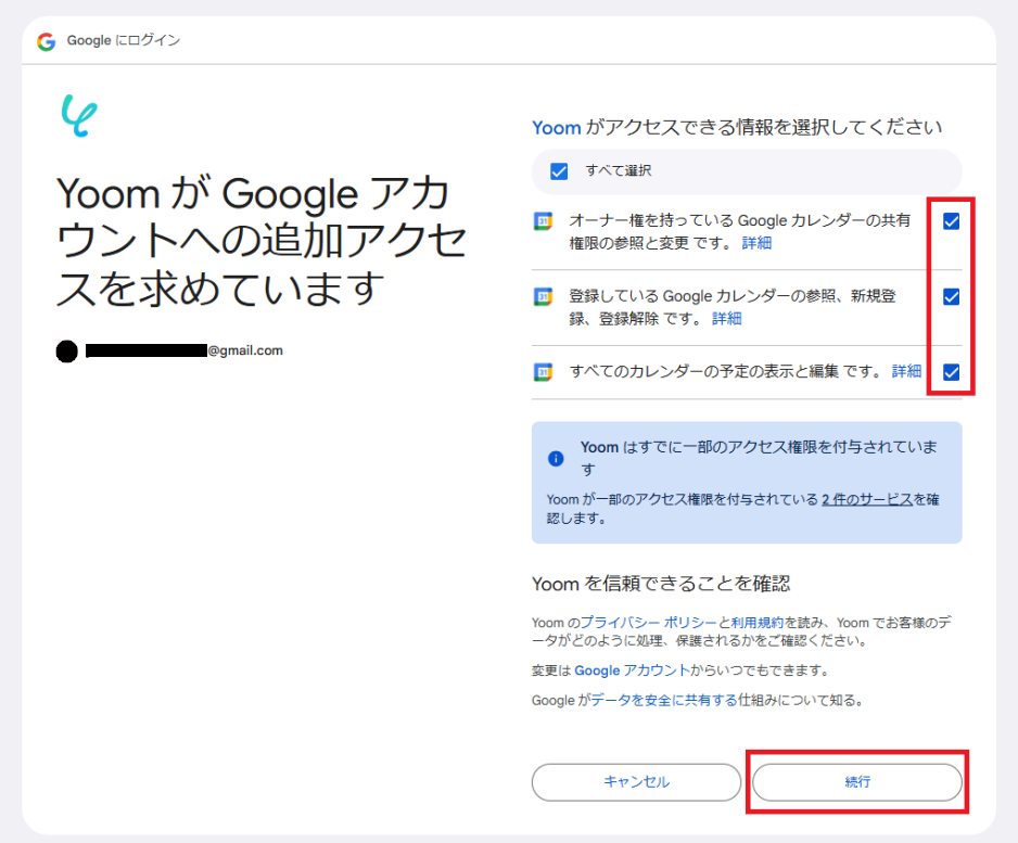 全てのチェックボックスにチェックを入れ「続行」をクリックしてください。