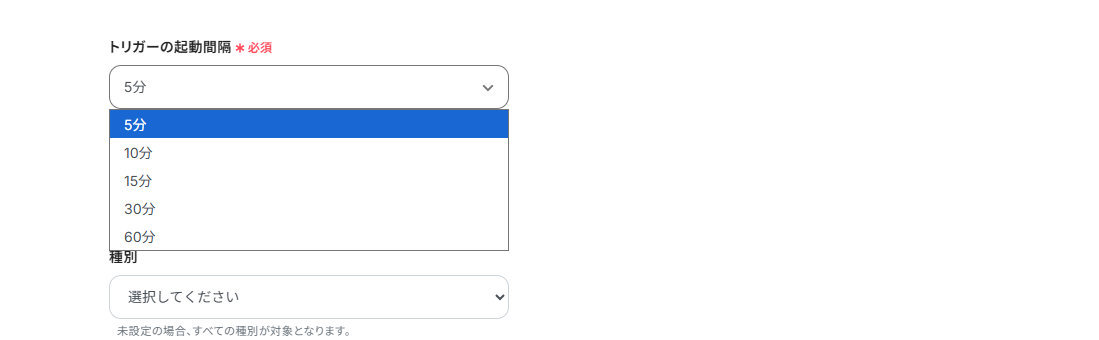 トリガーの起動タイミングは、5分、10分、15分、30分、60分のいずれかで設定できます。