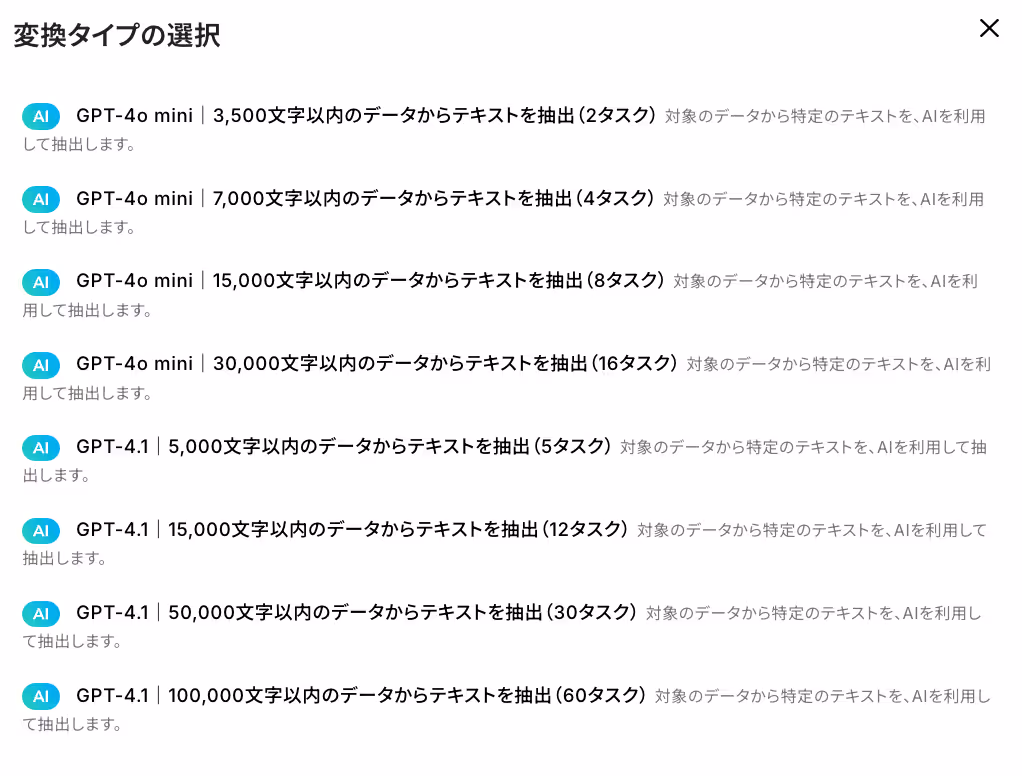 デフォルトでは「GPT-4o mini|3,500文字以内のデータからテキストを抽出(2タスク)」が設定されていますが、下図から自由に選択できるので、活用シーンに合わせて設定してみてくださいね!