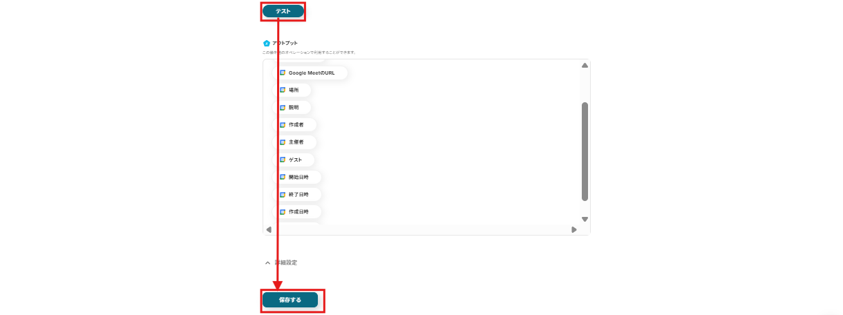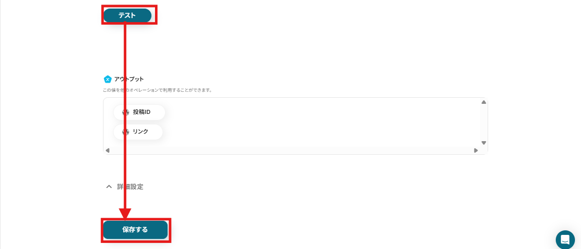 テストを実行したら、アウトプットが取得されるので「保存する」を押しましょう。