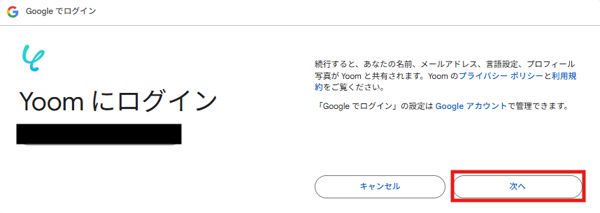 つづいて、Yoomと連携したいGoogleのアカウント情報を入力し、「次へ」をクリックします。