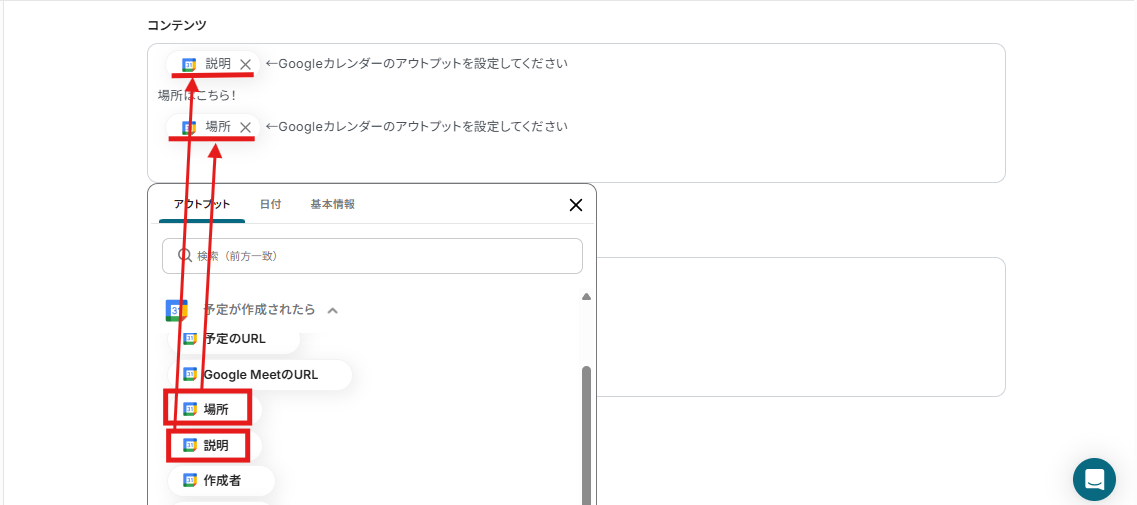 例えば、下記画像のように設定することで、Googleカレンダーに予定が作成されたら「説明」と「場所」を自動で取得し、WordPressのコンテンツに引用できます。