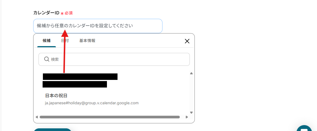カレンダーIDは、枠内をクリックし表示される候補から任意で選択してください。