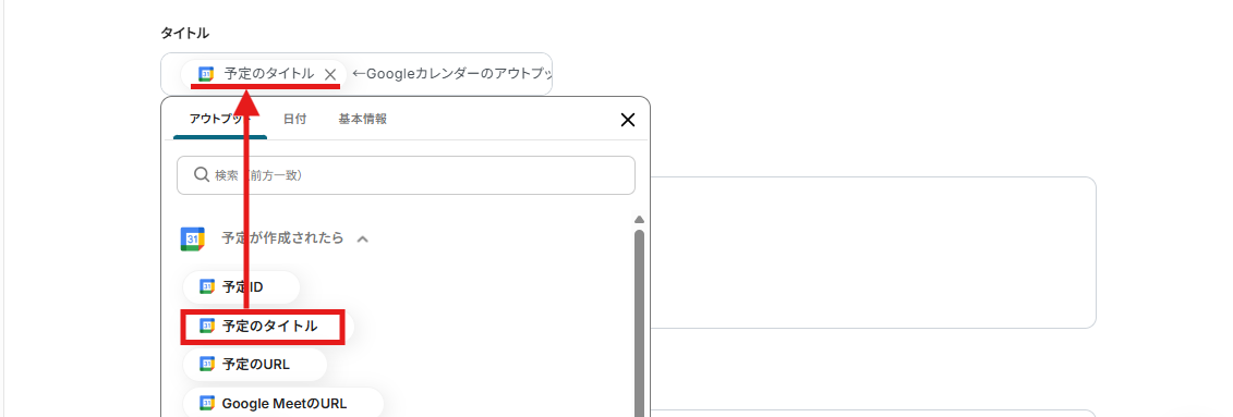 このように設定すると、Googleカレンダーの予定が作成されたら「予定のタイトル」を自動で取得しWordPressのタイトルに引用することができますよ!