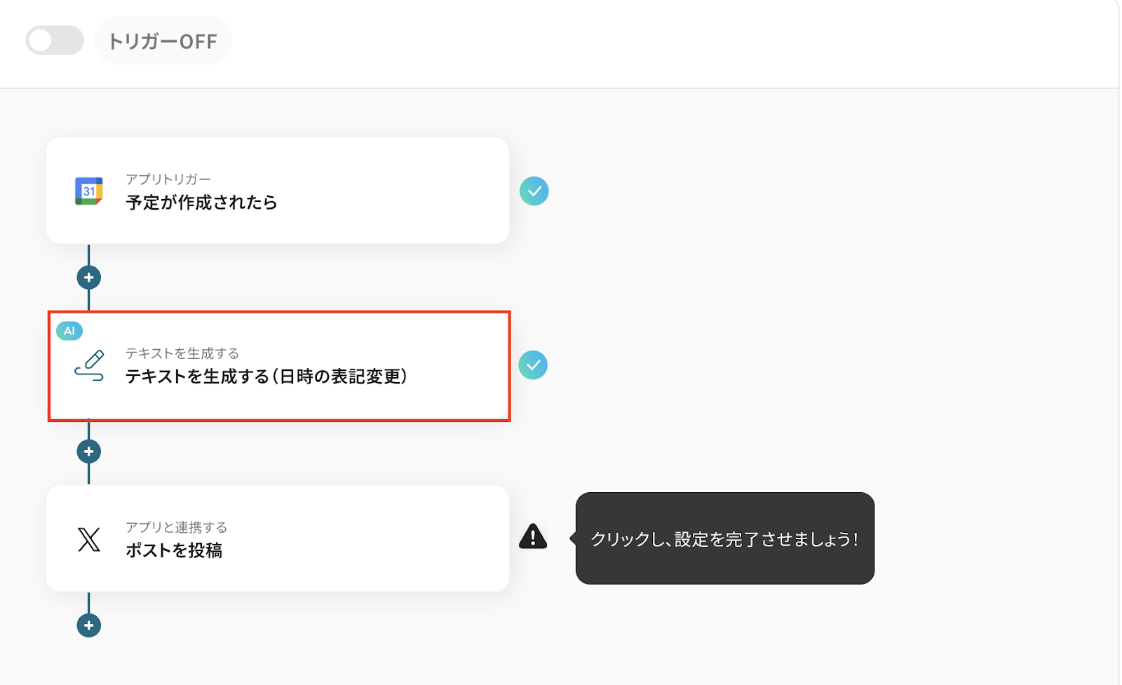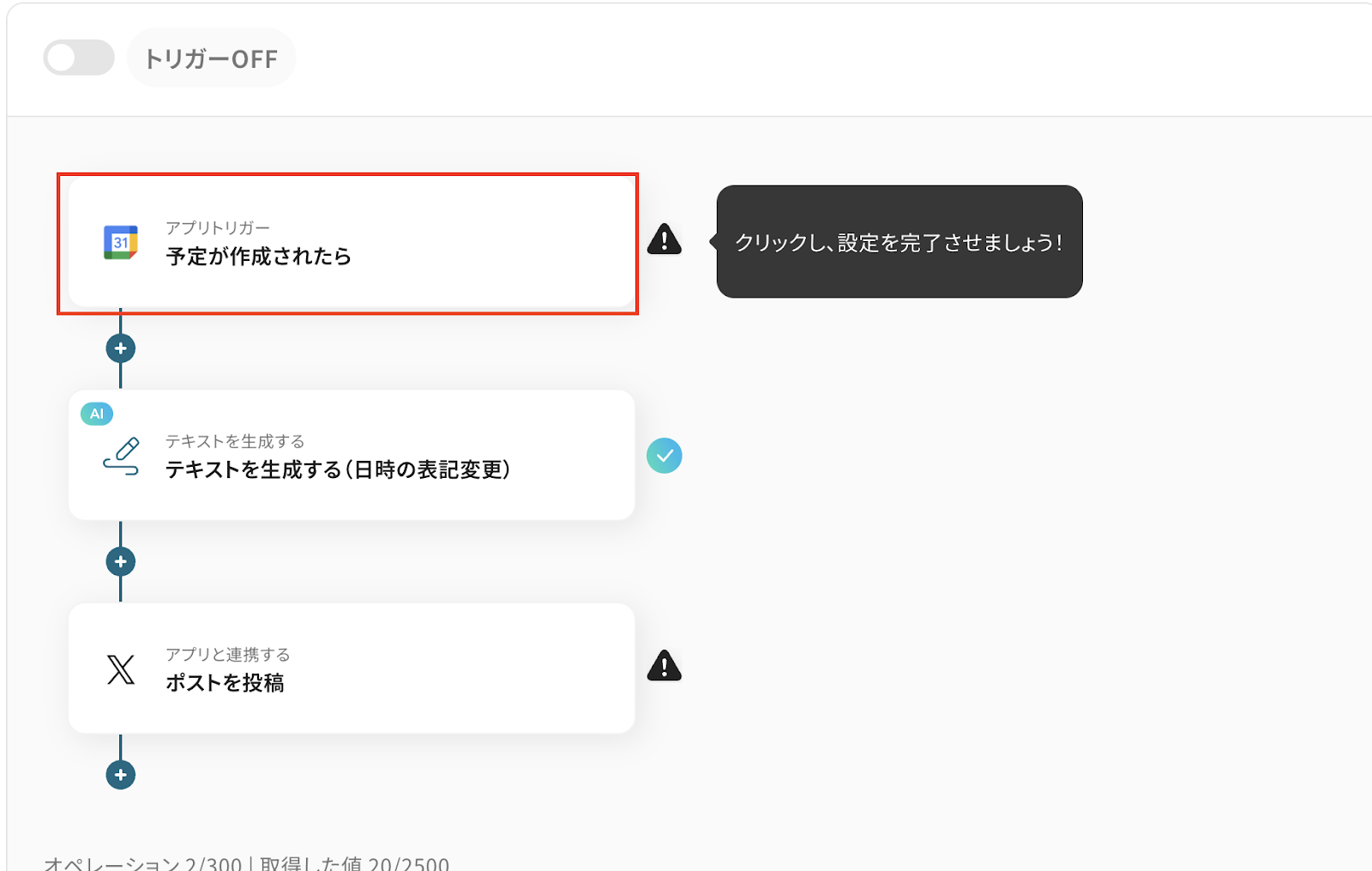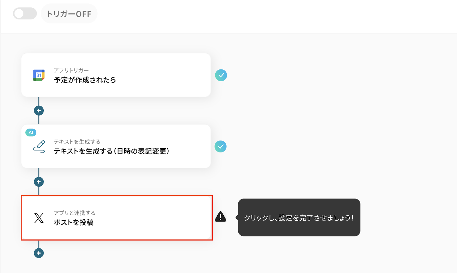 - Googleカレンダーのトリガー設定およびX(Twitter)のアクション設定