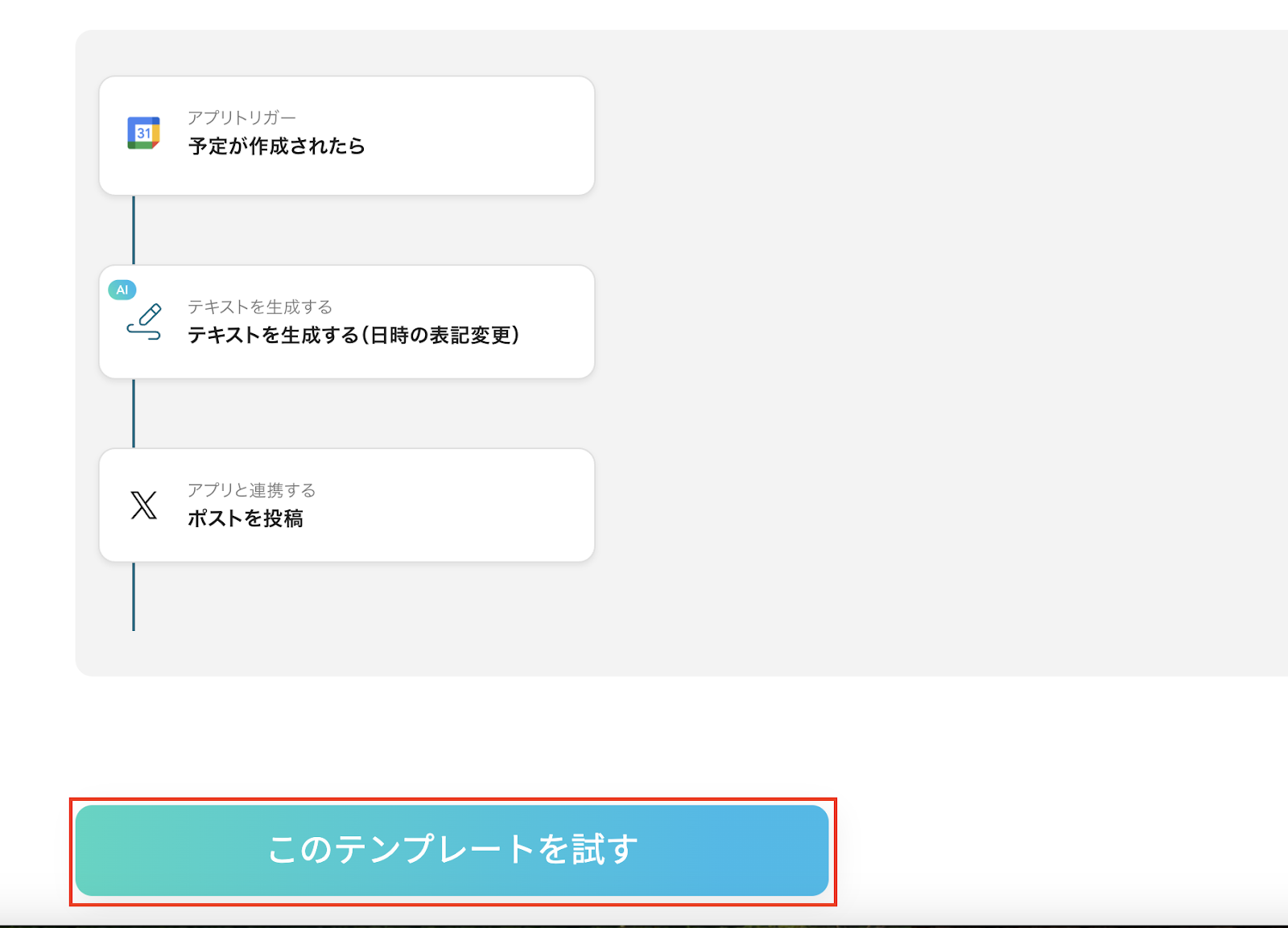 「Googleカレンダーで新規に作成されたイベントをX(Twitter)で告知する」フローは、スケジュール管理とSNS連携を自動化する業務ワークフローです。
