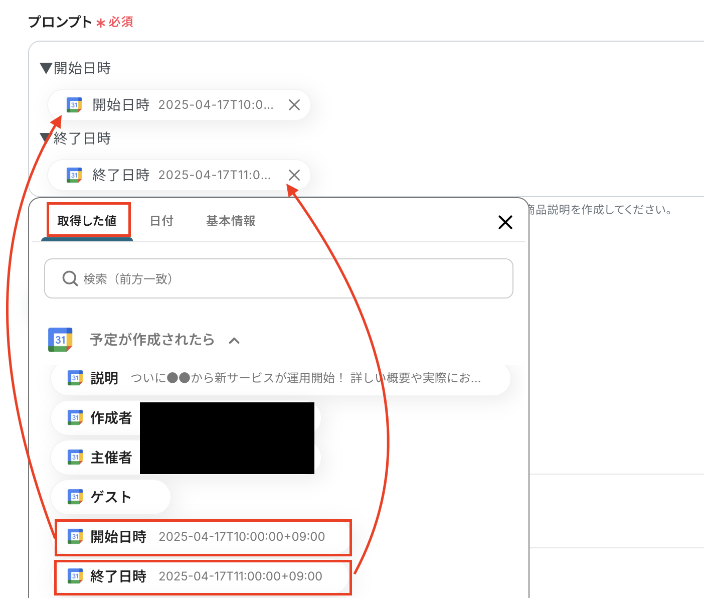 ・Googleフォームをトリガーとして使用した際の回答内容を取得する方法は下記を参照ください。