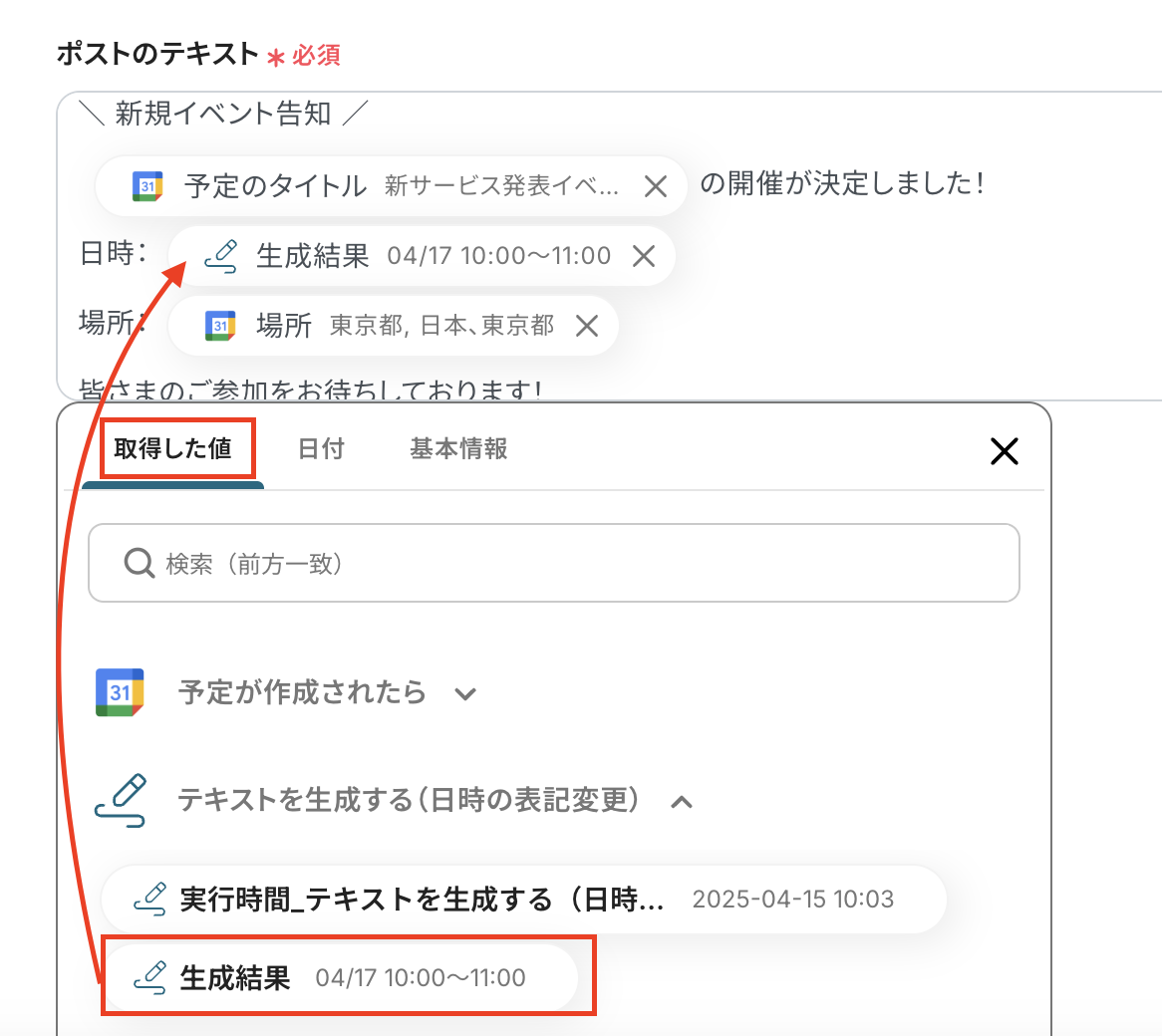 次に「テキストを生成する(日時の表記変更)」をクリックしましょう。