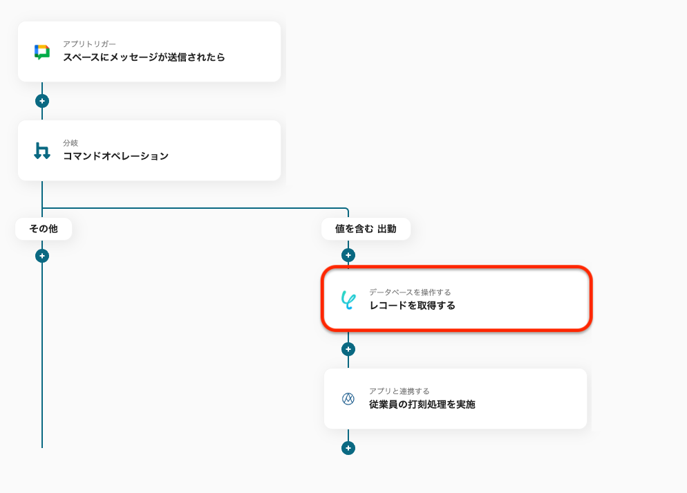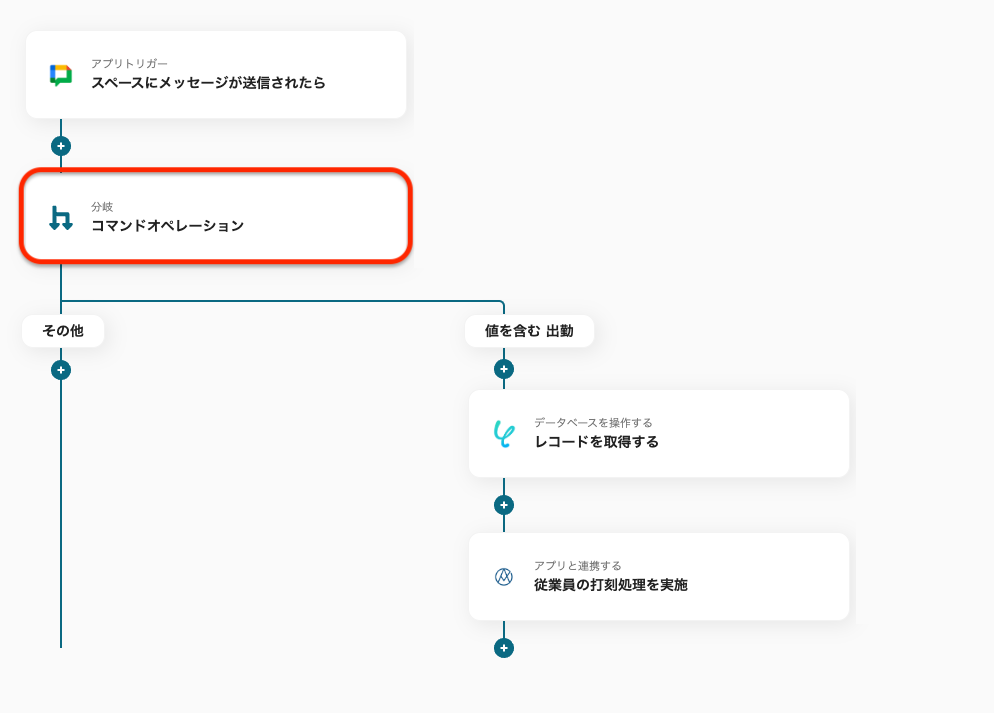 なお、この分岐設定や、この後設定するAKASHIのアクション内容をカスタマイズすることで、退勤や休憩の打刻にも対応することができます。