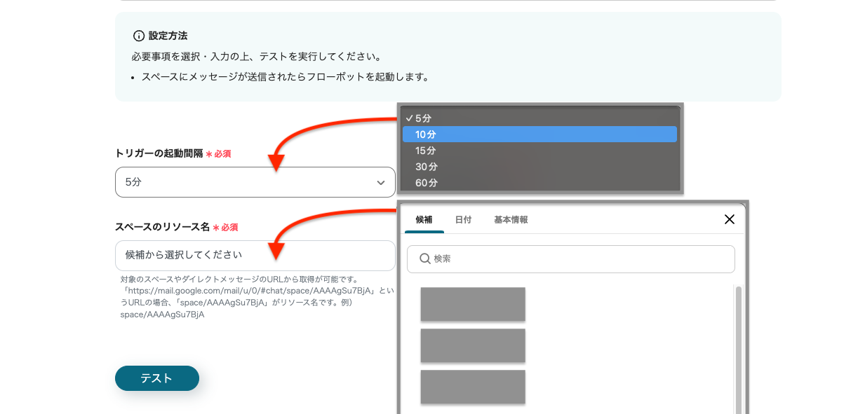 各項目を設定し終えたら、Google Chatで「出勤します」等のメッセージを送信後「テスト」をクリックしてください。