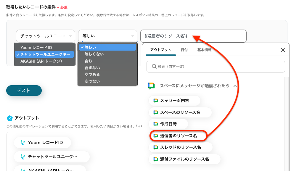 今回は画像のように、Yoomのデータベースに登録したチャットツールユニークキーと送信者IDが等しい、という条件を設定しました。