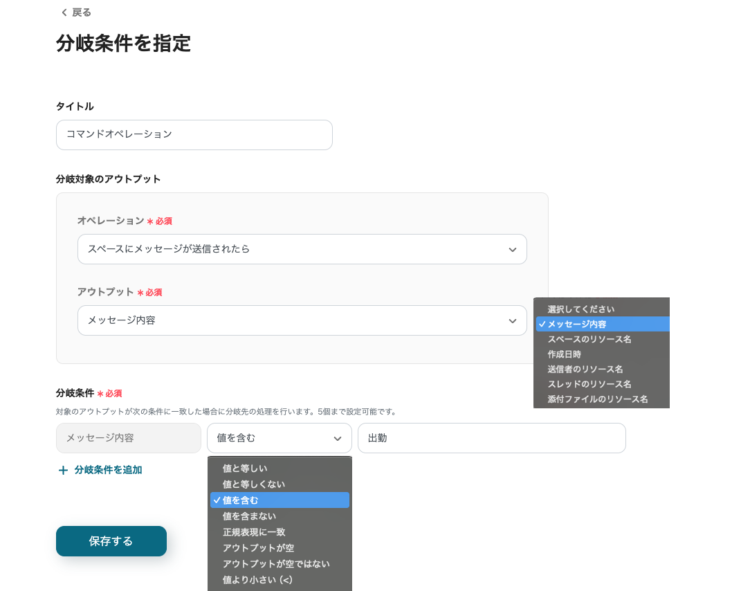 「分岐条件」で細かい条件を設定できます。今回は、メッセージ内容に「出勤」というテキストが含まれていたら、という条件を設定しました。