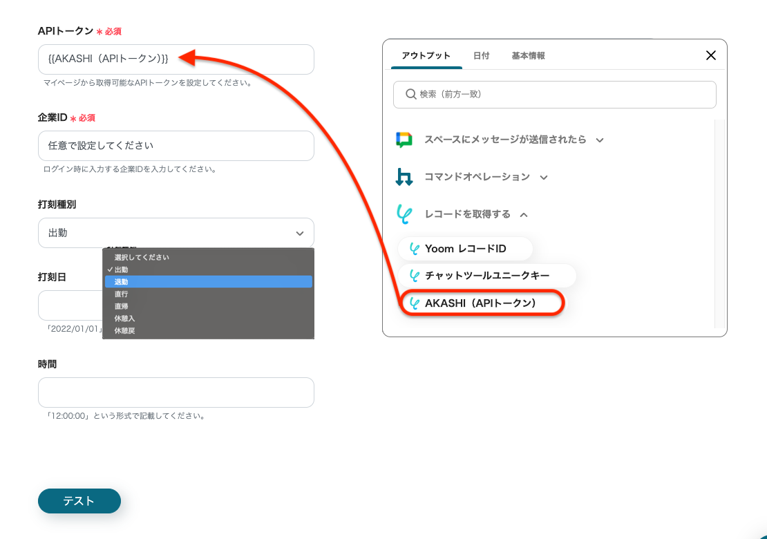 「APIトークン」は、欄をクリックし、表示された候補からYoomのデータベースに登録されているAKASHIのAPIトークンを選択してください。