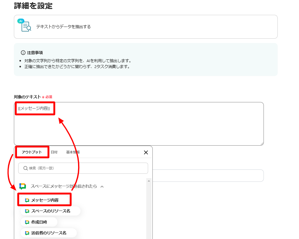 基本的に抽出する対象のテキストは、Google Chatのメッセージ内容のみなのでアウトプットから選択してください。