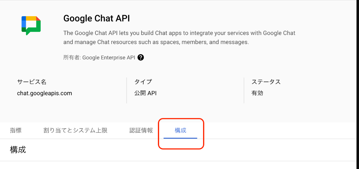 Google Chat APIが見つかったら「有効化」をクリックして構成の設定を行います。